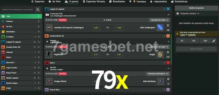O 79x oferece uma grande seleção de opções de apostas em e-sports com probabilidades competitivas